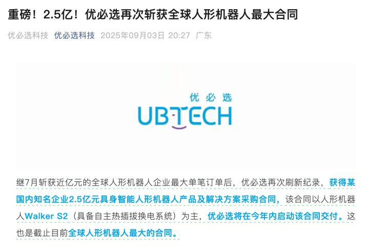 昨天(9月3日),机器人板块的优必选(09880.HK)就有好消息。公司获得了某国内知名企业2.5亿元的具身智能人形机器人产品及解决方案采购合同,优必选将在今年内启动该合同交付。